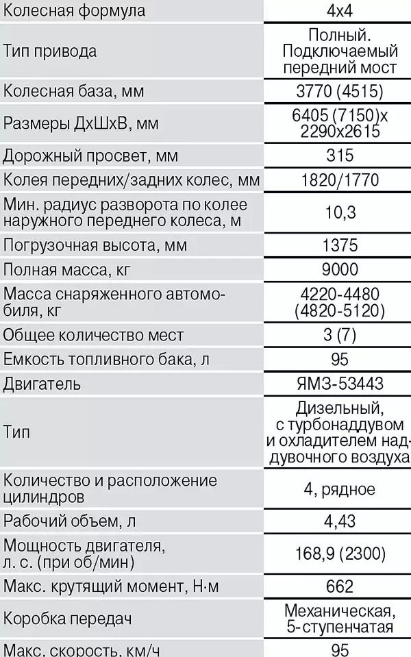 Коробка передач пятиступенчатая, с тросовым приводом переключения, собственного производства. Двухступенчатая «раздатка» управляется с помощью электропневматических приводов. Предусмотрено два места для подключения коробки отбора мощности: к коробке передач и к раздаточной коробке. Двигатель, кстати, оснащен горным тормозом (заслонкой).