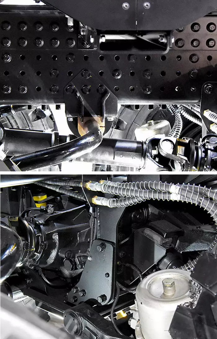 Подрамники мостов унифицированы, агрегаты трансмиссии тоже: колесные редукторы одинаковые, главные передачи почти одинаковые, только средний редуктор проходной. Подвеска всех колес унифицирована полностью. Полуоси, тормоза единые.