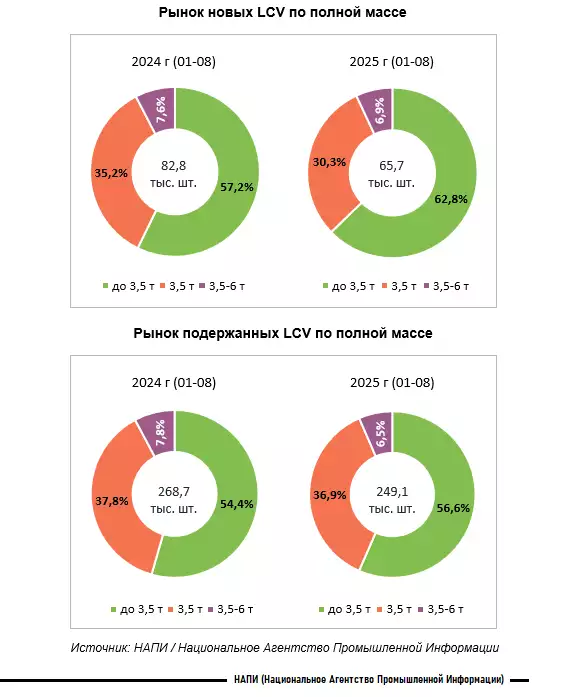 Анализ структуры рынка новых легких коммерческих автомобилей (LCV) за восемь месяцев 2025 года показывает интересные результаты. Несмотря на общее снижение объема продаж, сегмент техники с полной массой до 3,5 тонны продемонстрировал относительную устойчивость. Доля данного сегмента увеличилась до 62,8 %. Аналогичные процессы наблюдаются и на вторичном рынке LCV. Здесь доля автомобилей с полной массой до 3,5 тонны также возросла, хотя и менее заметно – на 2,2 процентных пункта.