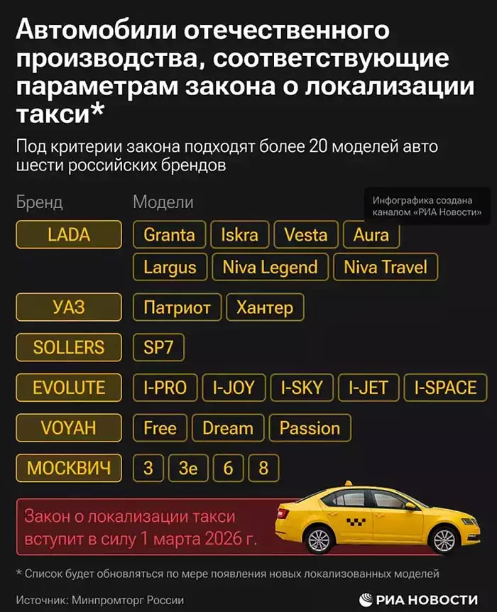 В Минпромторге составили первичный список машин, которые можно будет использовать для работы в такси с 1 марта 2026 года. С этой даты вступает в силу закон о локализации автомобилей для сервиса такси. В список вошли двадцать моделей шести марок.