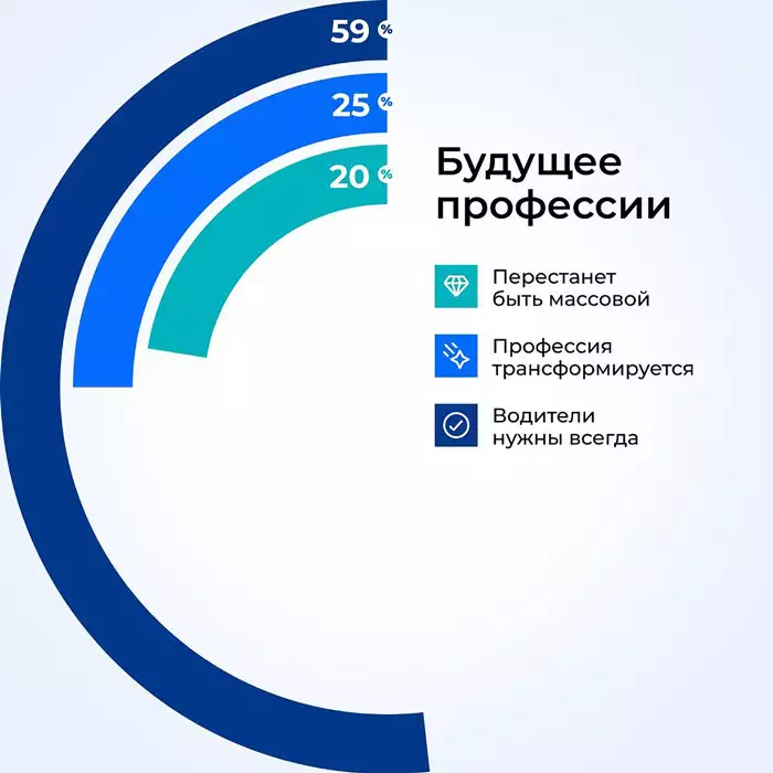 На вопрос о будущем профессии большинство респондентов (около 60 %) ответили, что водители будут нужны всегда. Еще четверть опрошенных уверены, что профессия трансформируется, но сохранится, а почти 20 % считают, что она перестанет быть массовой – прежде всего в крупных городах.