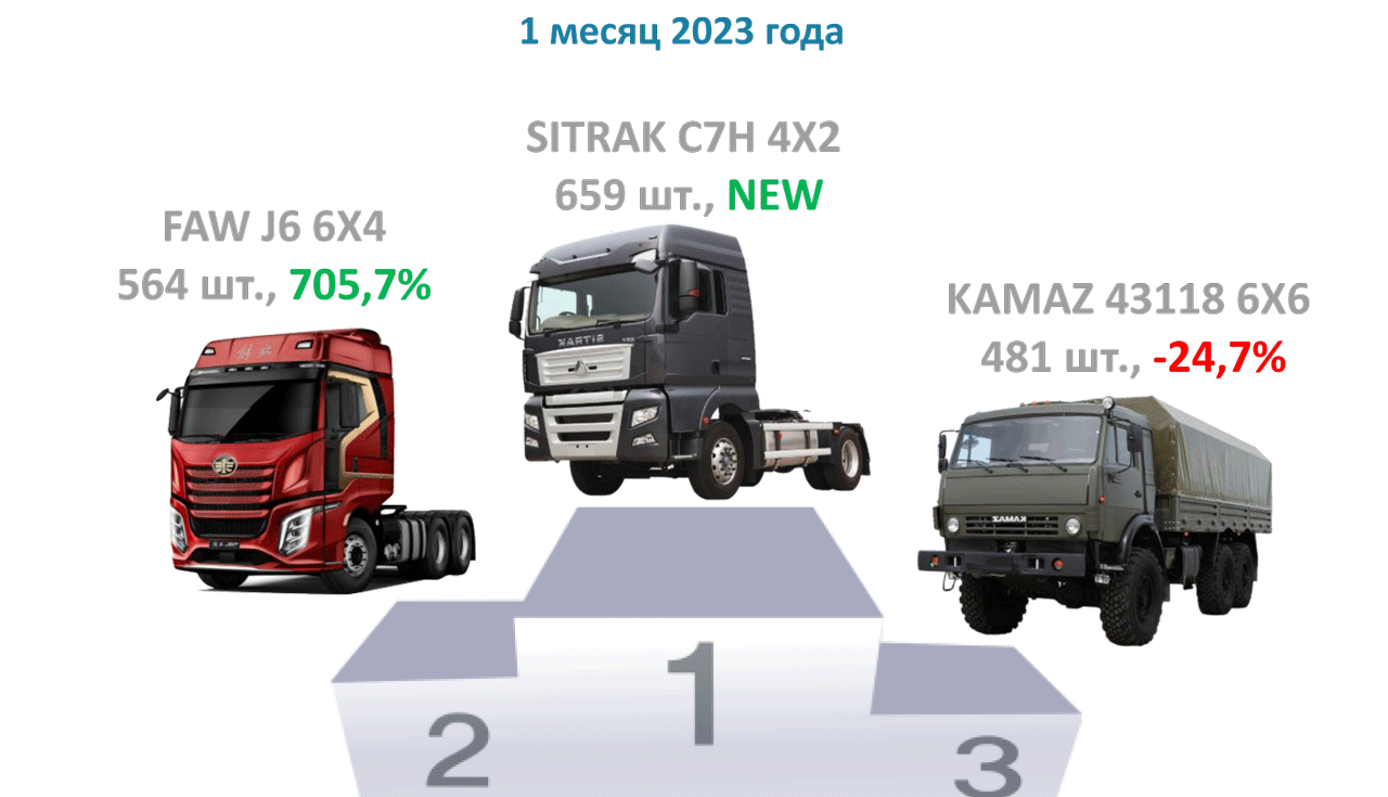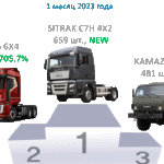 Тройку лидеров по количеству проданных машин открывает новинка рынка — китайский тягач SITRAK C7H с колесной формулой 4х2 (659 ед.). На втором месте расположился тягач FAW J6 6×4 (564 ед.). И замыкает первую тройку полноприводной автомобиль Камского автогиганта КАМАЗ-43118 (481 ед.). Модель Ульяновского автозавода — GAZon Next вошла лишь в первую десятку. Она на 9 месте с показателем в 325 машин.