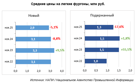 Однако спустя два года рынок претерпел значительные изменения. Согласно данным за ноябрь 2025-го, произошло существенное снижение цен: новые легкие фургоны подешевели на 5,1%, упав до 2,9 млн ₽, а подержанные — сразу на 17,6%, опустившись до 1,3 млн ₽.
