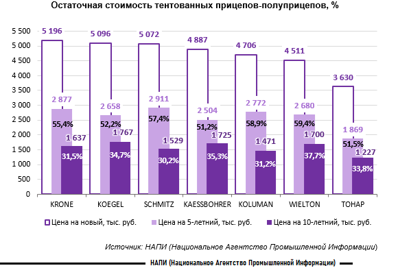 Меньше всего в цене на вторичном рынке теряют тентованные прицепы-полуприцепы Wielton, даже спустя годы эксплуатации. Через пять лет эксплуатации владелец может продать такую технику и купить новую, доплатив лишь 40,6% от ее актуальной цены. Спустя десять лет эта цифра увеличивается до 62,3%.