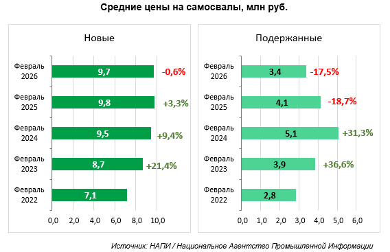 Новая техника: После резкого скачка в 2023 году (+21,4%) и умеренного роста в последующие два года, в феврале 2026-го цены впервые незначительно снизились (-0,6%). Сейчас новый самосвал в среднем стоит 9,7 млн рублей, что на 36,3% дороже, чем в 2022 году.