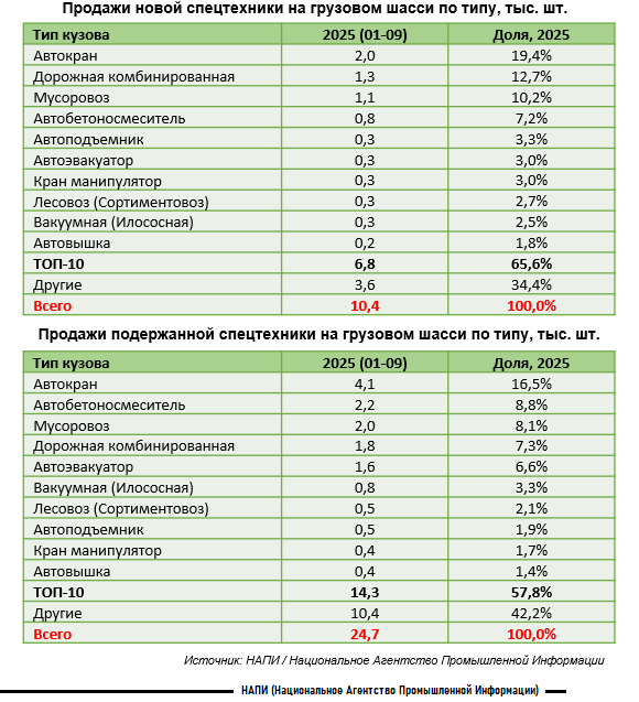 За январь-сентябрь 2025 года объемы продаж новой и подержанной специальной техники на грузовом шасси составили 10 400 и 24 700 единиц соответственно.