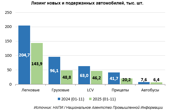 За 11 месяцев 2025 года объем нового и подержанного транспорта, приобретенного в финансовый и операционный лизинг, уменьшился на 35,7% по сравнению с прошлым годом, до 265 500 ед. Среди них 188 600 это новые автомобили, их число упало на 45,4%, тогда как продажи подержанных машин выросли на 13,4% (76 900 ед.).