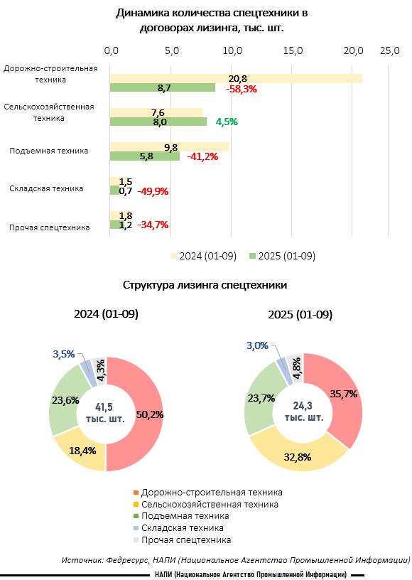 Дорожно-строительная техника: падение объема лизинга на 58,3%, доля сегмента снизилась с 50,2% до 35,7%.