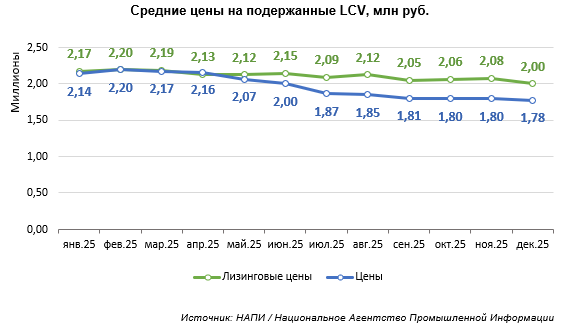 За период с января по декабрь 2025 года средний ценовой диапазон на подержанные LCV составил от 1,78 млн до 2,2 млн рублей. В то же время предложения лизинговых компаний дна такую технику держались в границах от 2 млн до 2,2 рублей. До середины весны средние цены и лизинговая стоимость LCV с пробегом оставались сопоставимы, однако с мая ставки лизинга пошли в рост.