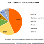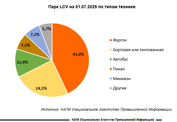Общий парк легкого коммерческого транспорта в России на начало июля 2025 года насчитывает 5,3 миллиона единиц техники. Лидером парка выступают фургоны, на которые приходится 43% (2,6 млн единиц). Вторую строчку занимают бортовые и тентованные автомобили с показателем 24,5% (1,3 млн единиц). Далее следуют автобусы с долей 12,4% (650 тыс. единиц).