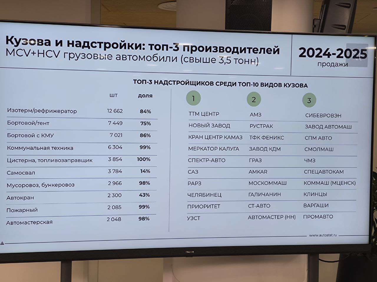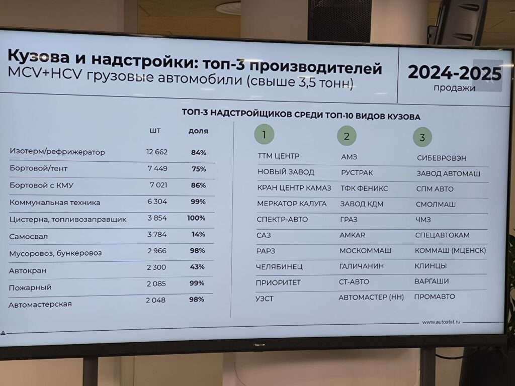 В рамках конференции CarXL агентство «Автостат» представило статистику по популярности типов надстроек и кузовов для грузовых автомобилей, а также озвучило рейтинг производителей надстроек. Эти данные показаны на слайде презентации: