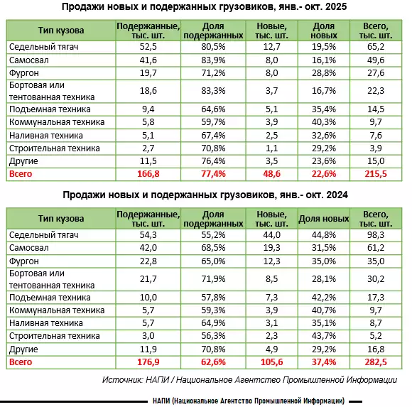 По итогам января-октября 2025 года, общий объем реализации новых и подержанных грузовиков упал на 23,7% относительно аналогичного периода прошлого года. Если в январе-октябре 2024-го рынок оценивался в 282 500 машин, то в текущем периоде цифра составила лишь 215 500 единиц.