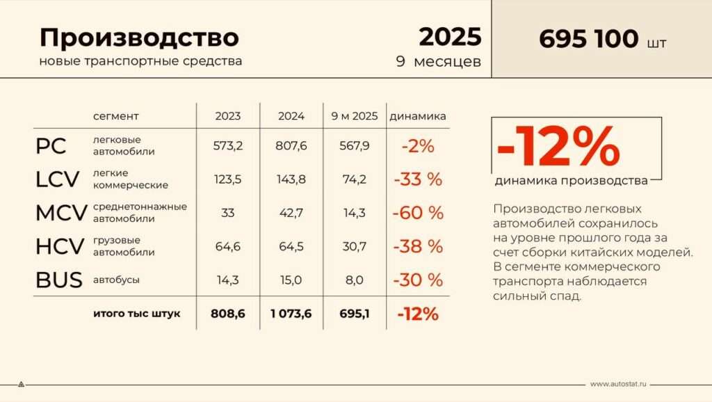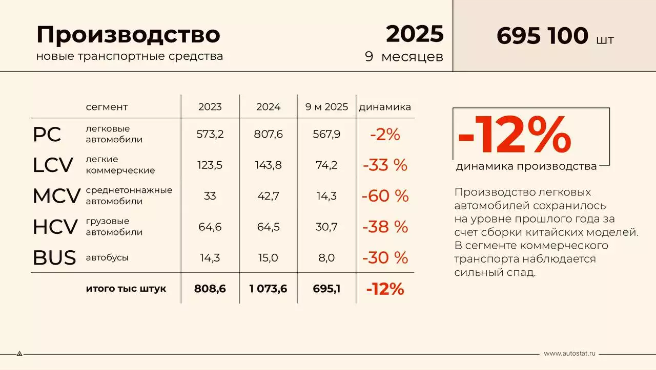 В течение девяти месяцев 2023 года российские автозаводы произвели 695 тысяч единиц автомобилей и автобусов, что на 12% меньше аналогичных показателей прошлого года.