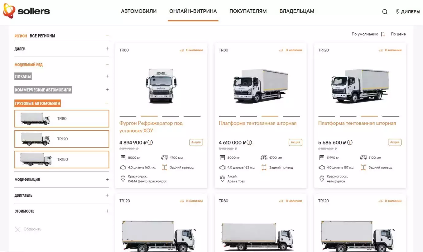 На ней представлен ассортимент продукции Sollers, доступный в разных регионах РФ. Платформа синхронизирована со складскими запасами дилеров, поэтому клиенты могут быстро получить актуальную информацию о наличии техники, оформить бронь, купить транспортное средство онлайн и заказать его доставку.