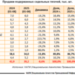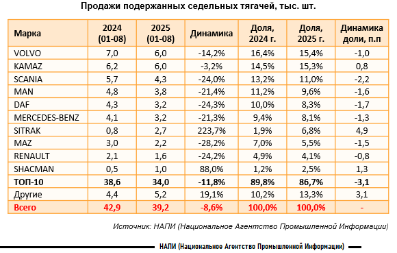 За январь-август 2025 года продажи подержанных седельных тягачей составили 39,2 тысячи единиц, сократившись на 8,6% относительно аналогичного периода прошлого года. При этом падение спроса на новые тягачи оказалось значительно больше — с 33,9 тысяч до 9,9 тысяч штук, или минус 70,8%.