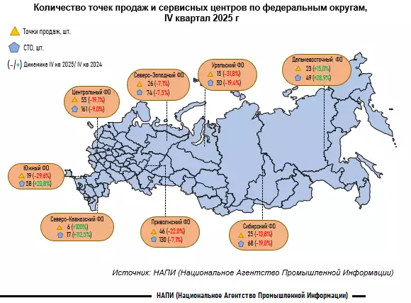 По итогам IV квартала 2025 года общее количество авторизованных точек продаж сократилось на 41 единицу (-16%), а число авторизованных сервисных центров уменьшилось на 30 единиц (-4,7%). Теперь количество дилерских центров составляет 215 единиц, а сервисных — 607 единиц.